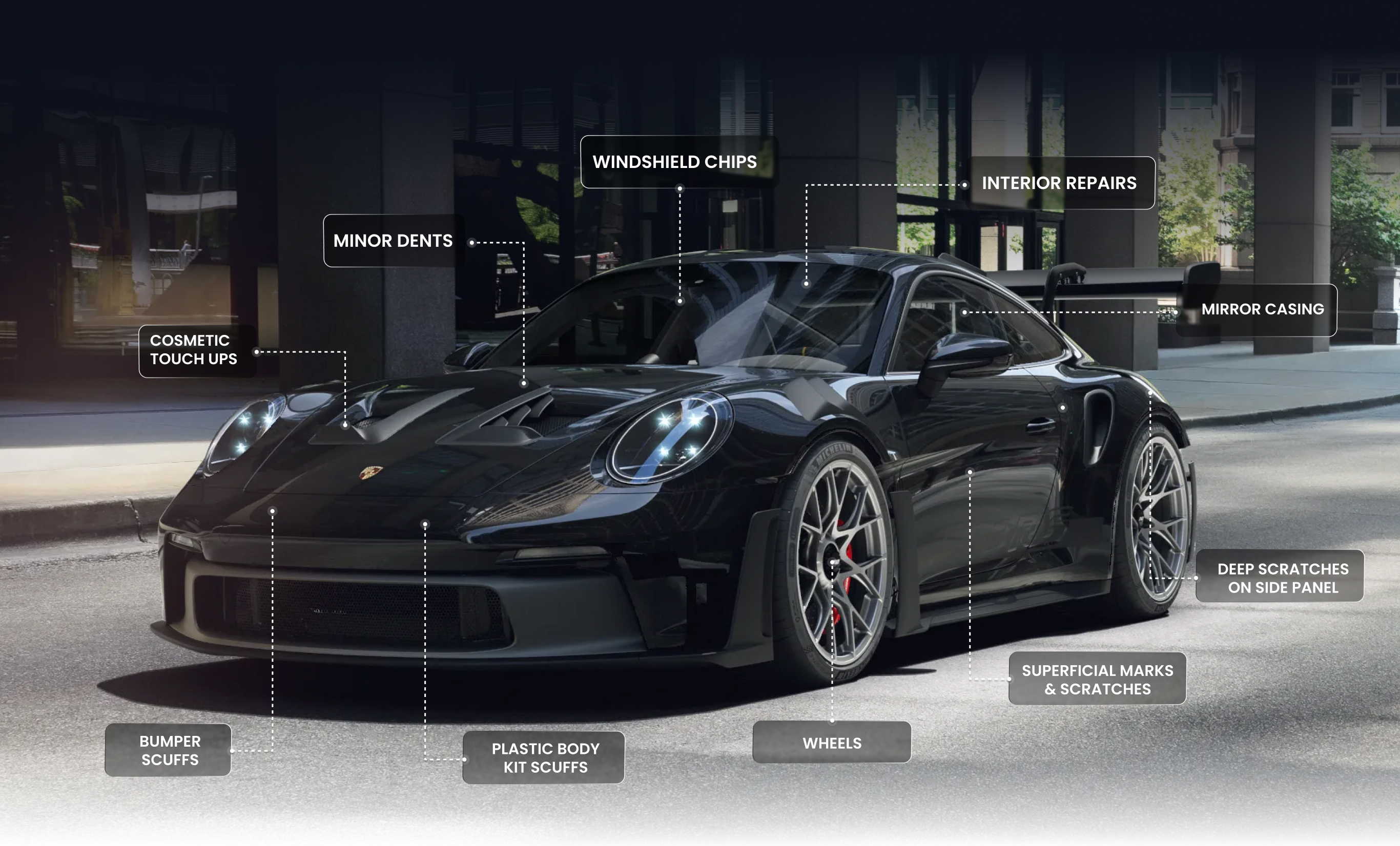 Bumper Scrapes, Windscreen chips, interior repairs, wheel repairs, deep scratches, dents, light scratches. Our programs cover the every day bumps and scratches on your vehicle, see vehicle diagram and terms and conditions for size limits